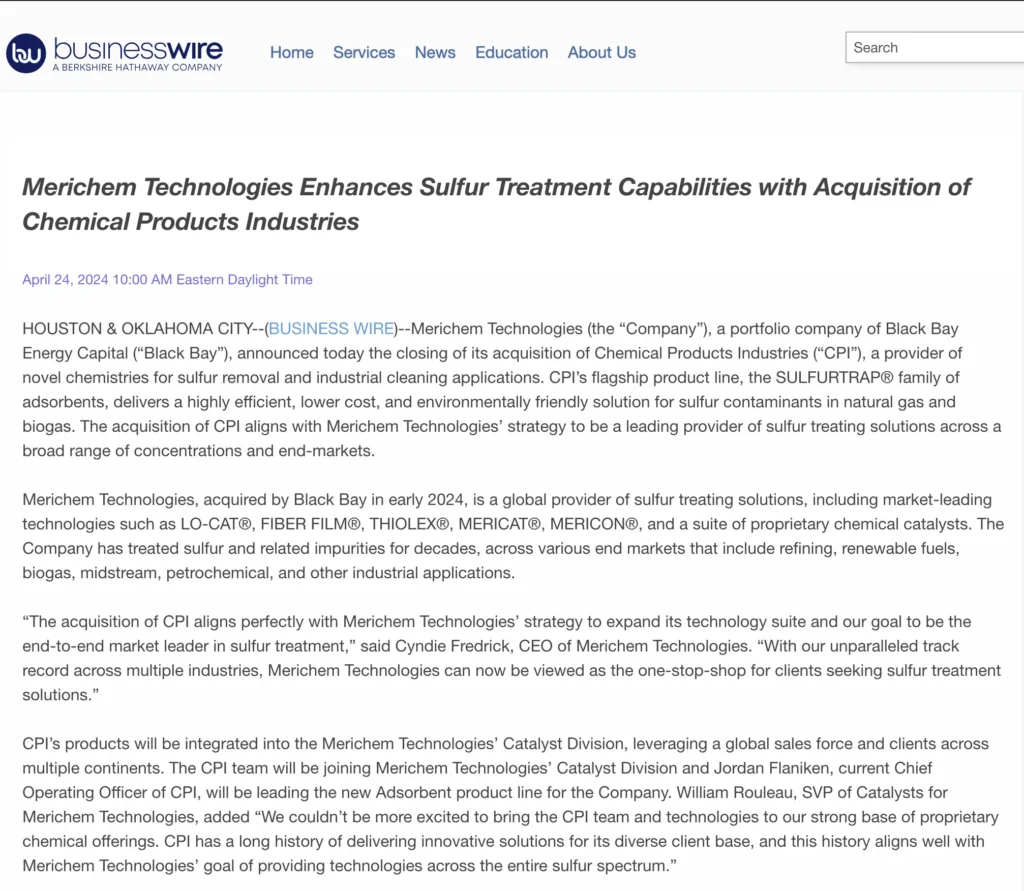 HOUSTON & OKLAHOMA CITY–(BUSINESS WIRE)–Merichem Technologies (the “Company”), a portfolio company of Black Bay Energy Capital (“Black Bay”), announced today…