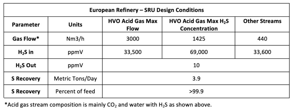 The existing higher capacity Claus SRU had been shut down when oil processing ceased at this refinery. The typical minimum H2S content for a feed to a Claus unit is 35 mole%. That condition is not available when the HVO process is operating. Modified Claus units can operate with less H2S in the feed stream, but to achieve >99.9% sulfur recovery, a tail gas treating unit is required downstream of any Claus SRU, which increases cost. Turndown conditions can also negatively affect Claus unit sulfur recovery efficiency.