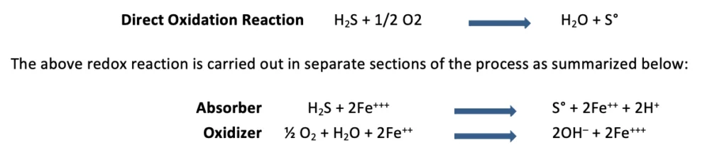 The Absorber reaction represents the oxidation of H2S to elemental sulfur and the accompanying reduction of the ferric (active) iron to the ferrous (inactive) state. The Oxidizer reaction represents the oxidation of the ferrous iron back to the ferric state.