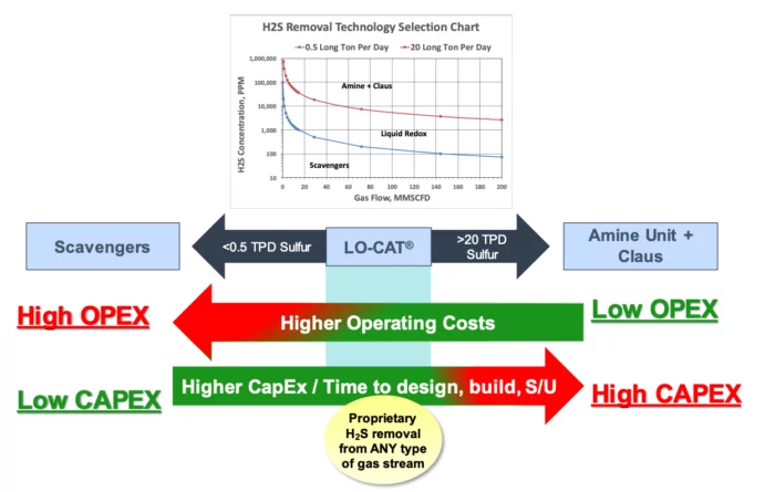 Liquid redox is an economical process for H2S removal and sulfur recovery within a given range as shown in Figure 2. On the low end of sulfur recovery, non-regenerative chemical absorbents (scavengers) are likely to be more economical due to the low capital cost of a two-vessel design. As the sulfur removal requirement increases, operating costs become prohibitive using scavengers. This is when a liquid redox process is advantageous due to lower operating costs. The higher capital cost of a LO-CAT unit is quickly paid out in operating savings versus replacement of the non-regenerative scavenger.