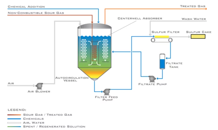 In a cylindrical autocirculation unit the sour gas enters a centerwell absorber and flows co-currently downward with the liquid redox solution. Outside the centerwell, air is being sparged into the solution to oxidize the catalyst. This also lowers the bulk density of the solution, helping it rise within the oxidizer section. The rising solution outside the centerwell and the force downard inside the centerwell sets up circulation betrween absorber and oxidizer without the need for pumping. Over 45% of LO-CAT® systems use an autocirculation configuration.